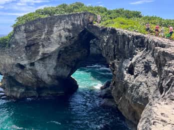 The beach is reached by walking down an unmarked, uneven, and rocky trail. At the split in the trail, visitors should take the left path to reach this hidden gem. The beach features turquoise and sparkling water crashing against the rocks, and is home to a variety of crabs. A swing hanging from a chain has also been installed for visitors to enjoy.